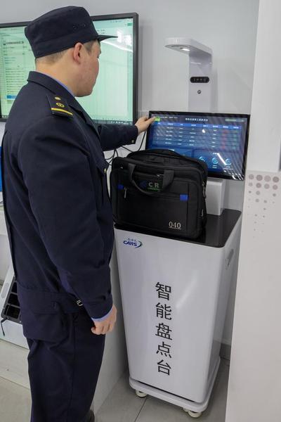 随车机械师正在做出库前准备,依托出退乘工具清点台自动清点全部值乘工具工装,确保值乘无遗漏。