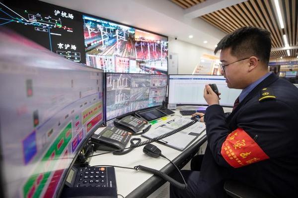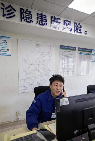 “虹心”青年突击队成员吕渐盛正在调度中心指挥调车作业。