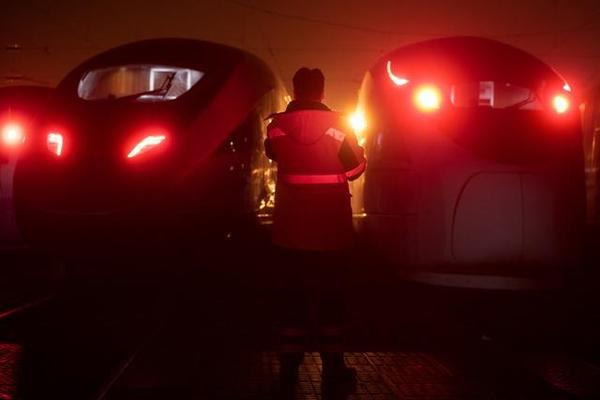 2月11日凌晨0:27,存车场作业人员万友成正对停放车组的头罩、前照灯、前挡风玻璃等进行检查。