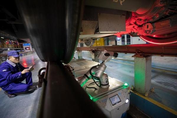 2月10日22:14,检修机器人正在对动车组齿轮箱等重要走行部件进行检查,地勤机械师朱贵来正在复核机器人检测出的故障点。