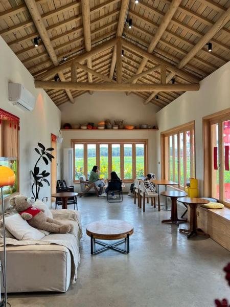 屋外是一片稻田,屋内温馨雅致,木质桌椅旁点缀着干花,淡淡的咖啡香萦绕其间,晕染成一幅静谧的田园画卷。不少游客会在拍完稻田后,点一杯咖啡坐下来,让行程慢慢收尾。
