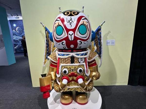 京剧彩塑脸谱非遗传承人赵楠则带来了京剧彩塑脸谱版的 MOLLY,从去年 2 月开始历经一年打磨,数版尝试才最终成型。“我们没有简单把脸谱贴在 MOLLY 身上,而是根据她的面部结构定制脸谱纹样,还融合了美猴靠、人字甲等京剧经典元素,既保留传统戏曲的精髓,又贴合 MOLLY 的形象特点,让传统脸谱艺术和潮玩无缝融合。”