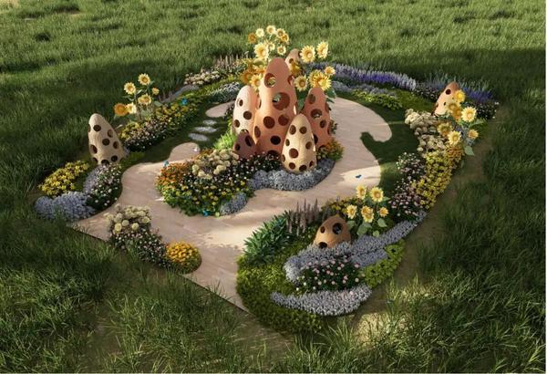 植物以高秆向日葵为视觉焦点,低矮地被作基底,黄为主色,蓝紫、白色点缀,层次鲜明。创新运用稻草漆打造仿生蚁穴,贴合还原蚁穴质感,强化场景沉浸感。