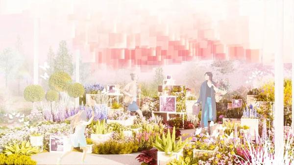 技术上以钢骨木纹构筑,半透纱幔彩印插画,随风摇曳,与花镜光影交织,营造诗意自然空间,实现材料、艺术与景观的有机融合。