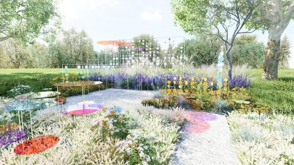 清晨以大花飞燕草、蓝羊毛的蓝调营造宁静感;午间切换为黄橙色系激发活力;昏间以绣球、花叶蒲苇、迷迭香与柳叶马鞭草的紫色系抚慰身心。同时,创新性回收废旧光盘,通过碎片点缀与悬挂装置,利用材料的反射特性使花境在阳光或灯光下富有光芒,高低错落的彩色pvc圆盘也增加了场地的轻盈感。