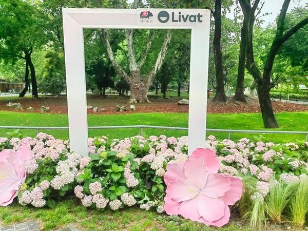 沿公园步道前行,地面上散落着粉、黄、绿三色的巨型花朵彩绘,像一条流动的花径,将游客引向各处惊喜。路边的混凝土装置层层堆叠,开口处探出红掌、绣球、蕨类等植物,临水而居,与水面倒影相映成趣。