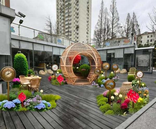 以愚园路、上生·新所为核心的花系造物部落,将花艺美学延伸至城市街区。长宁路口的IP形象“梧梧桐桐”以梧桐年轮为灵感,软萌可爱;环形花境、花语座椅、树干布艺花艺沿路铺展,让整条街道变成可漫步、可互动、可创作的生活秀场。花与艺术、街区与人文,在这里不再有边界。