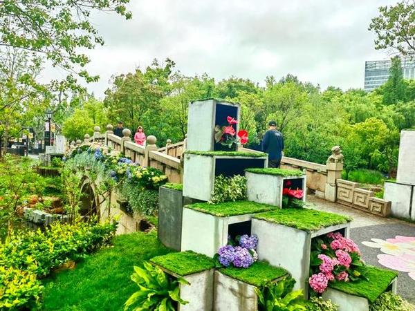 记者探营时看到,园区内,建于1959年的花岗岩大石桥“虹桥蒸雪”,作为中山公园十二景之一,也迎来了新生。北横通道借地重建后,石桥恢复了旧虹桥原貌,如今桥身两侧缀满了重瓣蓝紫绣球、皱边粉白绣球等珍稀品种,搭配垂坠的银叶菊,让古朴石拱与绚烂花瀑相映成趣,成为本届花卉节的标志性打卡点。