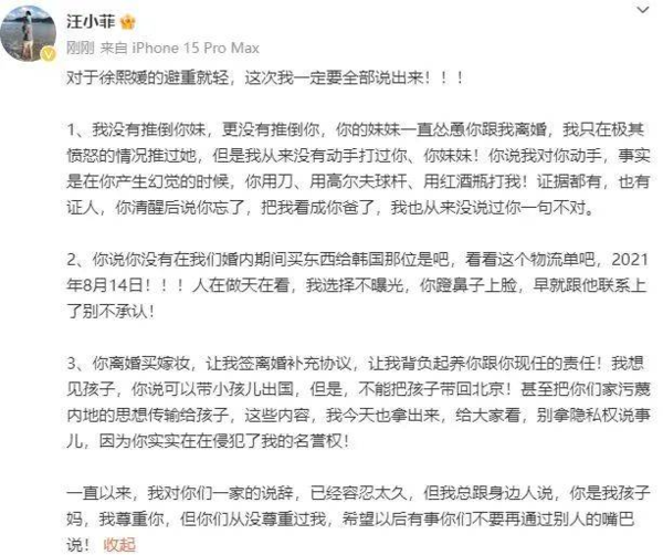 之后,汪小菲晒出多张证据来一一反击大S的各种指责,“对于徐熙媛的避重就轻,这次我一定要全部说出来!!!”
