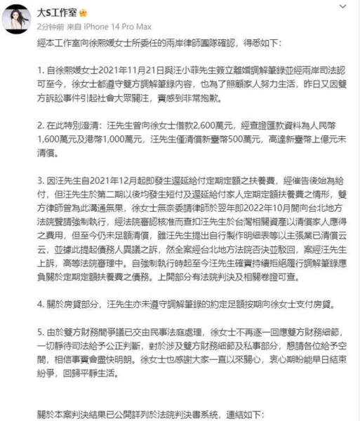 另外大S工作室也正式公布了此次案件的判决结果,称汪小菲确实曾向大S借款1600万以及1000万港币,除去已偿还部分他至今还欠大S高达上亿元台币。另外汪小菲还没有按照离婚协议支付俩孩子的抚养费,以及没有按照约定向大S支付房贷。