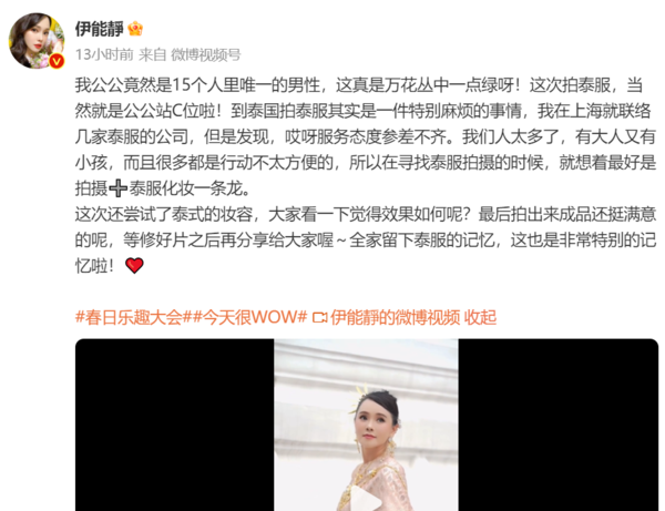日前,伊能静在社交平台上晒出全家人泰国旅行拍泰服的视频。