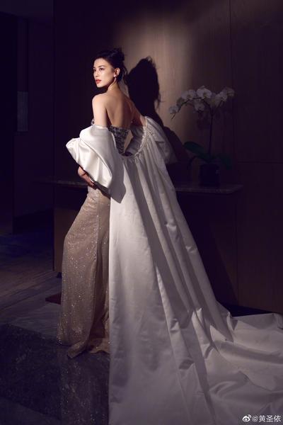 近日,黄圣依晒出自己一组礼服大片,照片中黄圣依身穿纯白露肩长裙站在台阶上似城堡里的公主,优雅迷人。