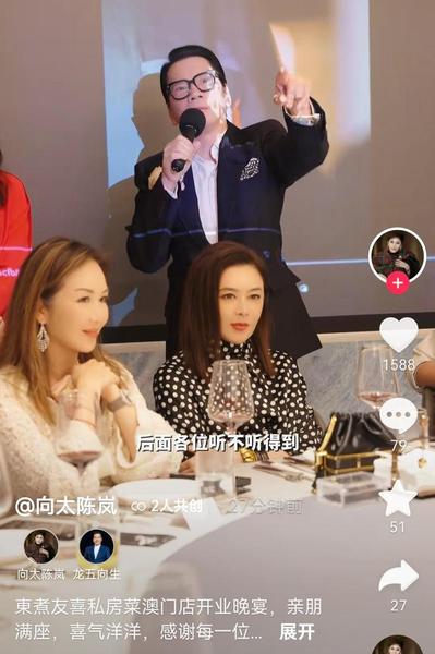 日前,向华强向太在澳门开的餐厅正式开业,除了在室外剪彩,还在室内设置了非常隆重热闹的晚宴。27日,向太更新动态,晒出了晚宴里的画面,现场可谓星光熠熠,向太的小孙子向笙也在场。