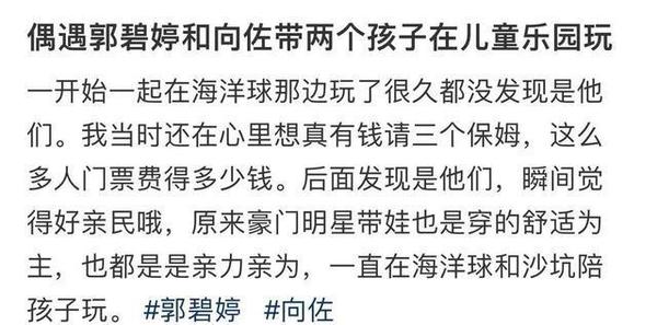 近日,有网友在社交平台发文,称“偶遇郭碧婷和向佐带两个孩子在儿童乐园玩,一开始还想真有钱请三个保姆,后来发现是他们觉得好亲民”,并且指出虽然有保姆,但向佐一起在陪孩子玩海洋球和沙坑。