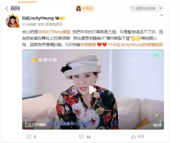 近日,向太陈岚在节目中称自己想要一个三孩的家庭,觉得会很热闹。5月20日,向佐在社交平台转发回应称:“放心吧妈,我们本来的打算就是三个,只是暂时满足不了你,因为我老婆在舞台上玩得很嗨。等她开心完,回家我们慢慢计划。”