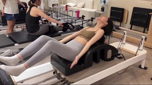 Lily身穿瑜伽服,躺在健身器材上,腹部扁平,四肢细长,看不到一丝赘肉,Lily的每个动作都非常标准,其实气质和体态都已经非常优秀,居然还这么自律。