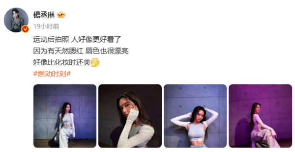 5月5日,杨丞琳分享一组运动后随拍,并配文称:“运动后拍照,人好像更好看了,因为有天然腮红 唇色也很漂亮,好像比化妆时还美”。