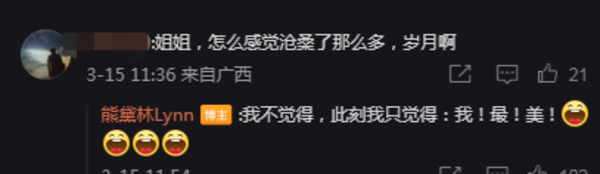 面对网友评论“沧桑了”,熊黛林则自信回应“我不觉得,此刻我只觉得:我!最!美!”