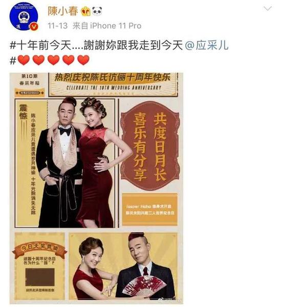 这对夫妻俩虽然年龄差了16岁,但感情一直很稳定,11月13日还是他们结婚十周年的纪念日。当天陈小春特意发文庆祝,并感谢爱妻这么多年的付出。