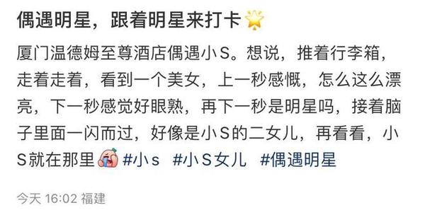 近日,小S与家人及好友罕见现身厦门被偶遇,入驻当地某高级酒店,女儿以及老公都来了。这也是小S时隔多年后首度来到大陆,消息曝光后立刻引发外界热议。