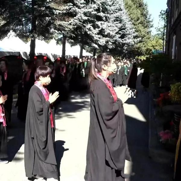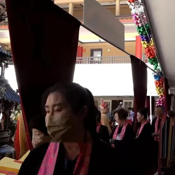 从画面来看吗,当天参加法会的人数众多,大家都身穿黑色长袍,在寺面前排着长队,轮流进入寺庙祭拜。王祖贤当天扎着高马尾,双手合十,虔诚地站在队伍中。