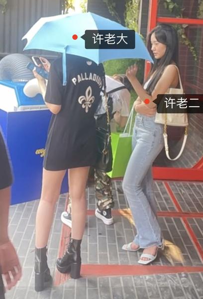 照片中穿着牛仔裤,长发披肩的这位正是小S的二女儿许韶恩Lily,低头玩手机的是许老大许曦文Elly,身着背带裤的则是许老三许曦恩Alice。站在画面最后面戴着墨镜的这位就是小S。