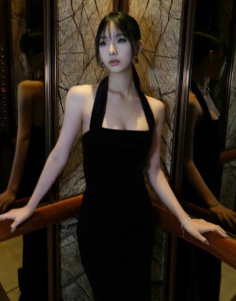 许曦文身着黑色挂脖连衣裙,尽显好身材。