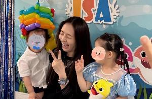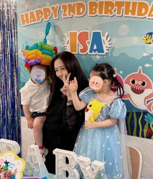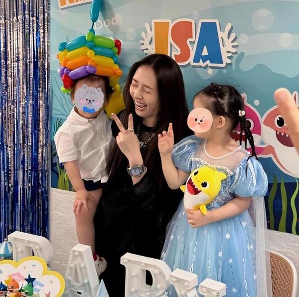郭碧婷当天参加生日宴时穿着一套简单的黑色便装,素颜露面的她心情大好,和儿子互动频繁,同时也是留下了她和孩子们非常多的靓影。