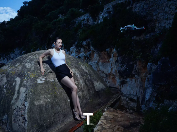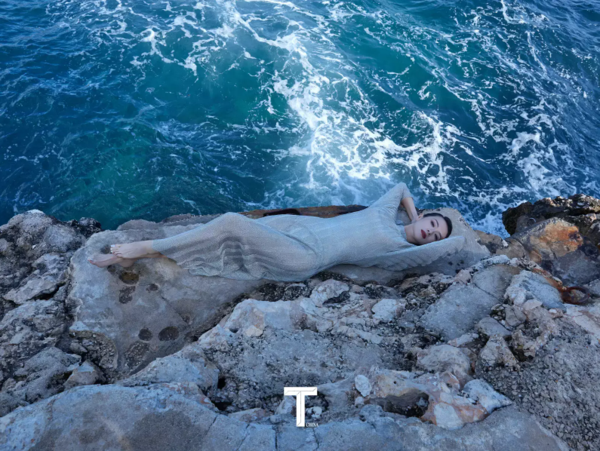 章子怡身着纱制透视裙躺在海岸礁石上。