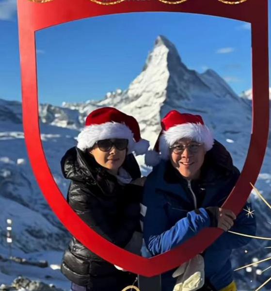 郭晶晶也晒出了她跟丈夫霍启刚的甜蜜合照,她戴着墨镜和圣诞老人的帽子,穿着黑色羽绒服搭配深色裤子,看起来有点酷。霍启刚也戴着圣诞老人帽子,站在妻子郭晶晶的身边,笑得十分开心。两人在红色边框下合照,背后是美丽的雪山,两人一起享受着温暖的阳光,拍下了这张甜蜜合照。