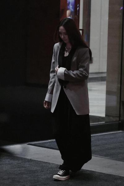 当晚郭碧婷一身职业装束露面,灰色西服套装搭配黑色宽松长裤,整体造型简约且时尚。郭碧婷一头长发披肩而落,脖颈处戴着的项链格外抢镜,款式漂亮且有个性。