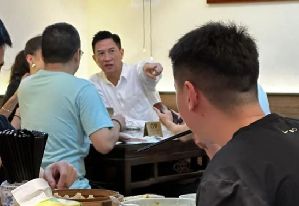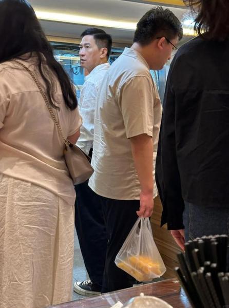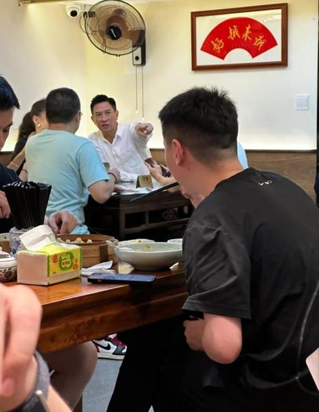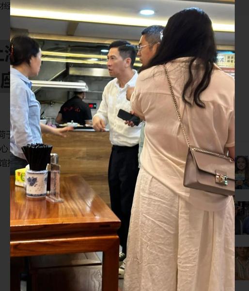 照片中,他身穿白色衬衫,与女助手一起进入面馆寻找座位。他大方地坐在行人通道旁,与路人毫无区别。