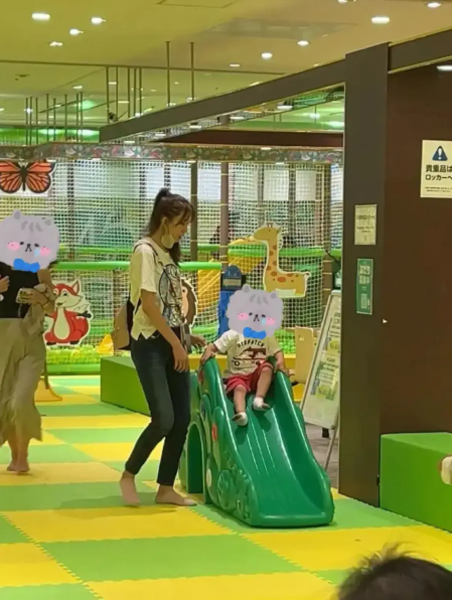 林志玲陪儿子玩滑梯。