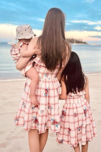 照片中的昆凌和俩女儿身穿亲子装,同款红白格纹充满青春气息。昆凌披散着棕色的长直发,手臂纤细,体态少女。