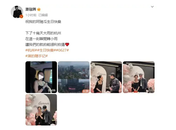 萧敬腾发文称:“祝我的阿猪瓜生日快乐。下了十几天大雨的杭州,在这一刻瞬间转小雨,让我们的航拍能顺利拍摄。”