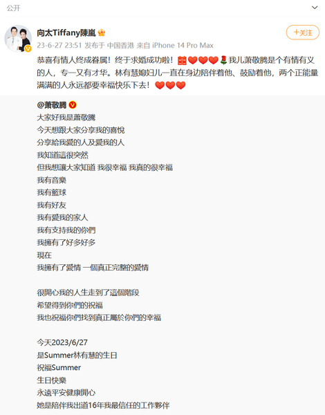 萧敬腾为老婆林有慧庆生 晒二人合照感情超恩爱
