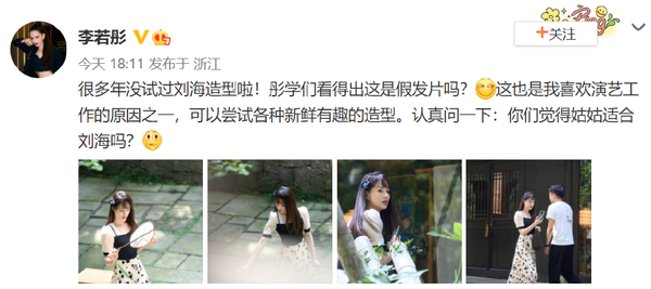近日,李若彤在社交平台晒出自己的齐刘海造型照并配文:“很多年没试过刘海造型啦!彤学们看得出这是假发片吗?这也是我喜欢演艺工作的原因之一,可以尝试各种新鲜有趣的造型。”照片中,李若彤身穿黑白连衣裙,好少女!