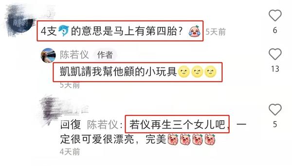 有网友评论区留言询问她是不是怀孕了。陈若仪回应该网友,表示手里的小海豚仅仅只是双胞胎儿子中的凯凯让她照顾的小玩具而已。