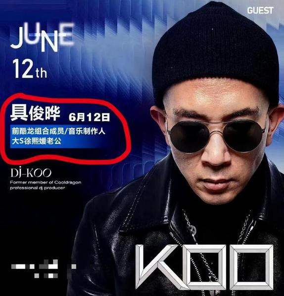 细看上面的海报,具俊晔演出的时间确定是在6月12日,区别在于他目前在海报上面的身份名称。前酷龙组合成员,音乐制作人,大S徐熙媛老公!