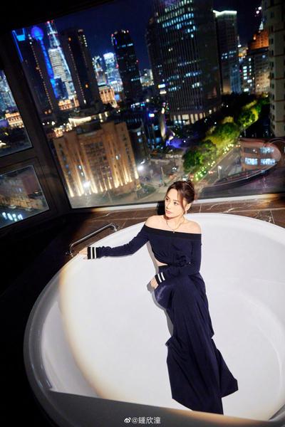 阿娇身着黑色抹胸与黑色阔腿裤 高级千金感满满