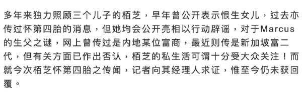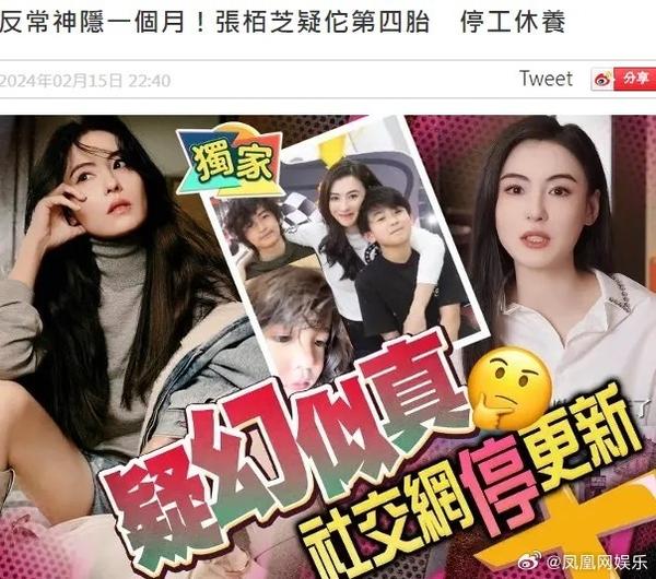 据港媒爆料,张柏芝疑似怀四胎,正停工休息,向来活跃于社交平台的她,自上月中开始未有再推出新视频,最近的一条影片更是身穿松身衫及只拍摄上半身,刻意避开腹部位置。记者向其经纪人求证,至今仍未获回复。