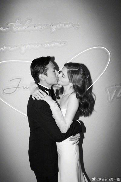下图里,穿着白色婚纱礼服裙的吴千语与新婚老公施伯雄当众甜蜜拥吻,夫妻二人一个美丽动人,一个帅气十足,真的是绝配呀有木有!而看到吴千语亲吻老公时扬起的嘴角,看得出来,她是真的嫁给了真爱、嫁给了幸福,恭喜。