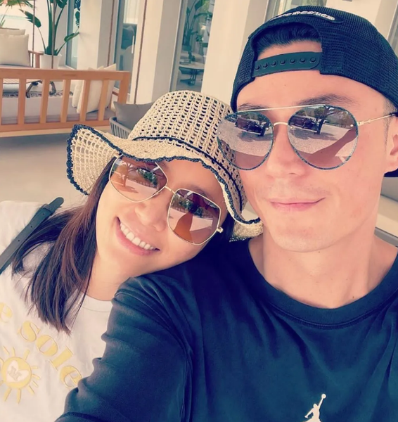 林心如与老公霍建华久违的合照。林心如身穿白色短袖,头上戴着编织帽。霍建华穿着一件黑色短袖,反戴黑色鸭舌帽,与妻子组成“黑白配”。两人双双戴着墨镜,在镜头下微笑,满脸幸福。