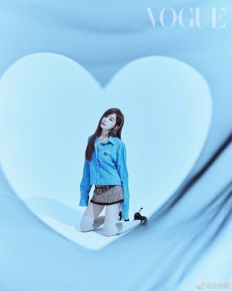 大片中,王心凌身穿露腰短衣加短裙,小蛮腰和细腿十分抢眼。