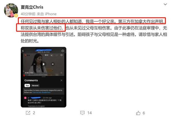 更意思的是,夏克立随后又发了一条微博,再次强调自己是一个好父亲,还称第三方在加拿大作出声明,称双亲从未伤害过他们,也从未见过父母互相伤害。夏克立这里指的第三方,显然就是指女儿夏天。