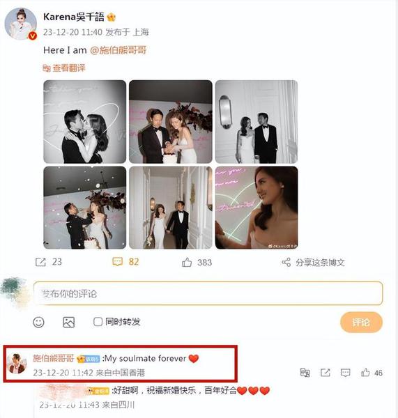 20日,演员吴千语在个人社交平台晒出多张婚纱照官宣与施伯雄结婚。紧接着,施伯雄现身评论区,并甜称新婚娇妻是“永远的灵魂伴侣”,甜齁了有木有。而施伯雄也在差不多的时间里,晒出了与吴千语的甜蜜合照撒狗粮,小两口发布情侣款文案示爱对方,高糖满满,确实是甜翻众人。而看到两人从相恋到结婚,真是打心底为他们感到开心。