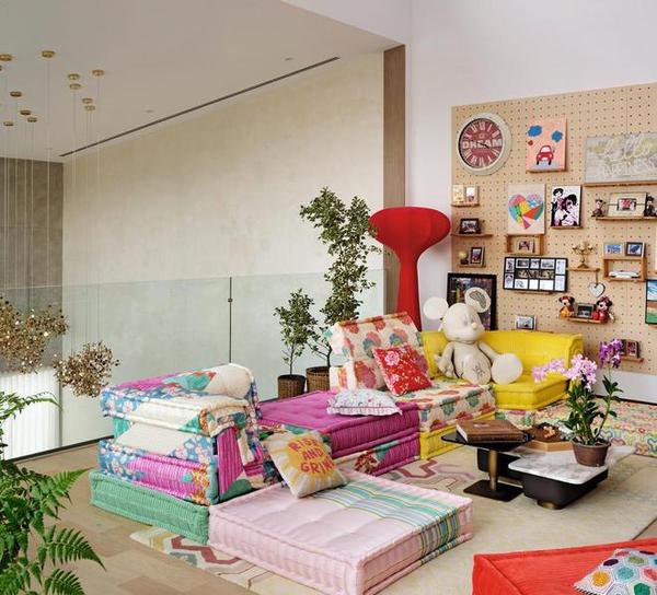 有一个小客厅还被打造得五彩斑斓,就像迪士尼一样。一家四口是迪士尼铁粉,去过世界各地的迪士尼乐园。墙上挂的是NeiNei和Max的作品以及送给爸爸妈妈的礼物,观赏性极强。