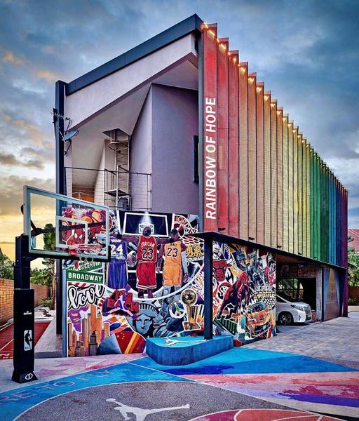 除了私人泳池、健身房之外,吴尊还有一个私人篮球场,而且一旁的石柱子五彩斑斓,充满了正能量。