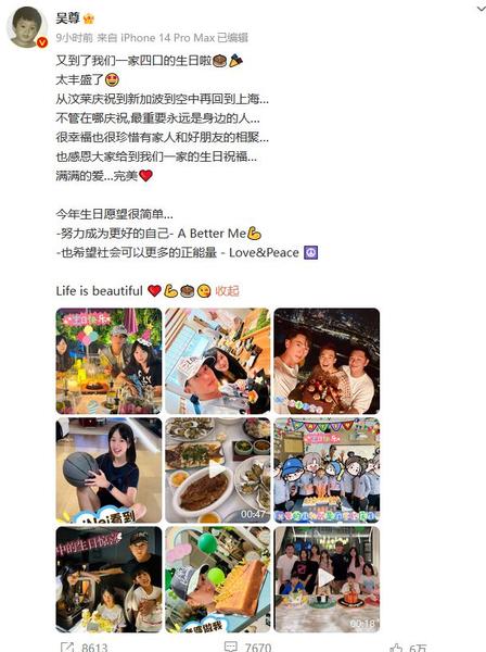 12日,吴尊在自己的个人社交账号上晒出了他一家四口一起庆贺全家福的照片,并表示他们一家四口的生日从文莱庆祝到新加坡,再回到上海,也很感恩跟他们一起庆贺生日的人。