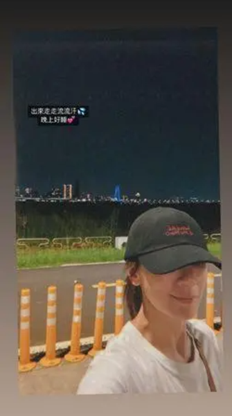 照片中,贾静雯身穿白色T恤,戴着黑色棒球帽,在夜晚的河堤公园自拍。她的表情轻松愉悦,背景远方可以看到远处的高楼和蓝色灯光装饰的桥梁,配上文字:「出来走走流流汗,晚上好睡。」而她晚上外出运动,帽下脸蛋几乎素颜,仍可看出肌肤紧致。